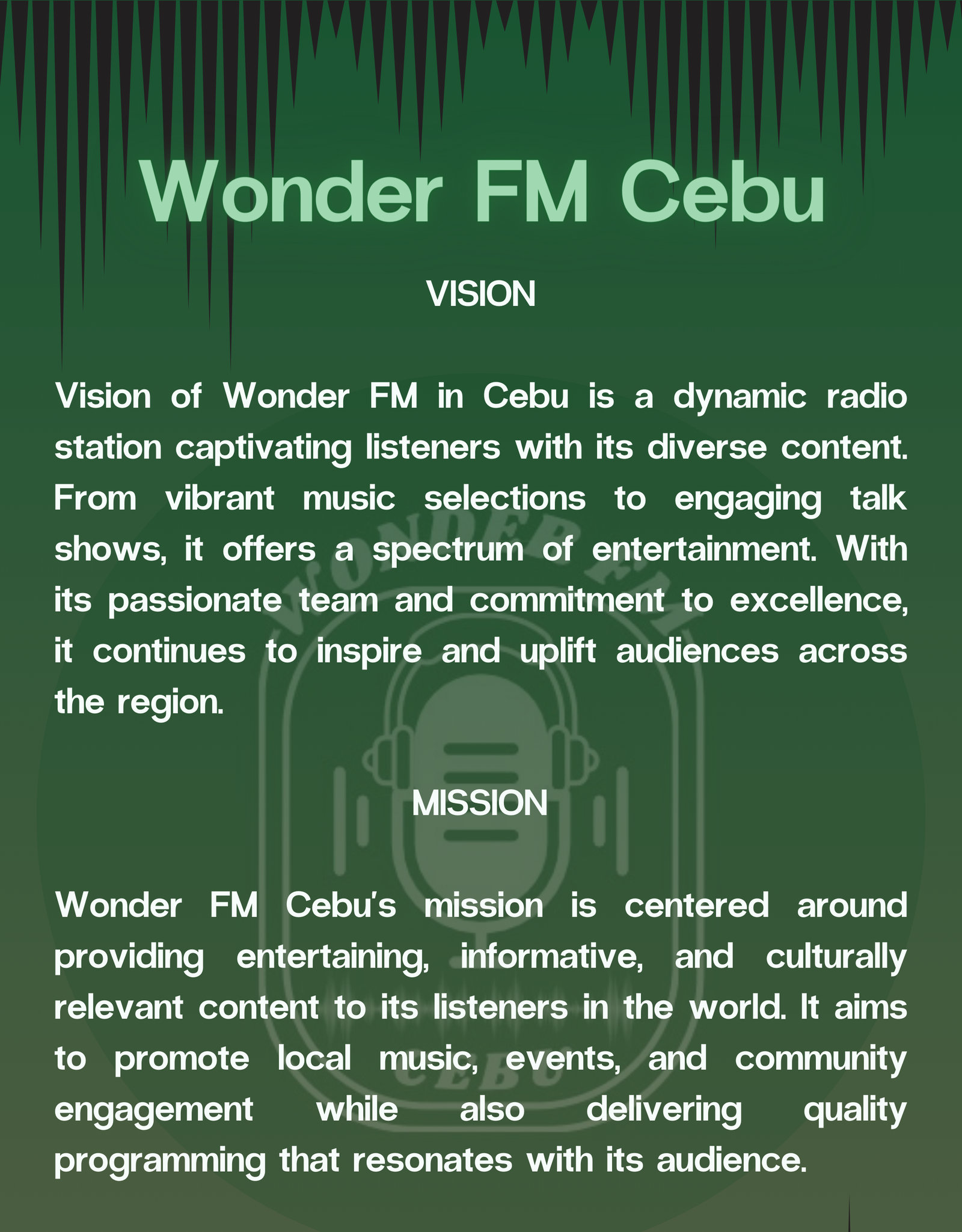 "Wonder FM Cebu" represents a digital platform that delivers audio content, such as music, talk shows, news, and more, to listeners in Metro Cebu and beyond. Operating exclusively online, it utilizes the internet to reach its audience, offering convenience and accessibility to users who can tune in from anywhere with an internet connection. As a radio station based in Metro Cebu, it may focus on local news, events, and cultural aspects relevant to the region, while also catering to broader interests and tastes.